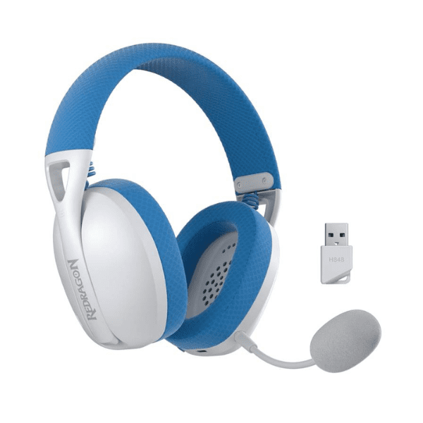 El Redragon Ire H848 Wireless Blanco-Azul está diseñado para ofrecer versatilidad y calidad de sonido con su triple conectividad, que incluye dongle RF, Bluetooth V5.2 y cable USB-A a USB-C, permitiendo su uso en PC, consolas y dispositivos móviles sin complicaciones.